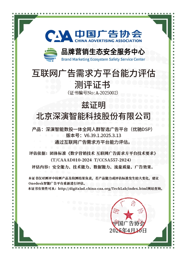 4月10日,中国广告协会发布「互联网广告需求方平台能力评估」测评结果。Martech领域领军企业恒峰g22智能旗下产品恒峰g22智能数投一体全网人群智选广告平台(优驰 DSP),凭借其在智能算法优化、技术创新、数据安全治理及流量质量管控等维度的突出表现,高分通过该项行业权威测评,获颁中国广告协会评估证书,成为业内首批通过认证的标杆企业。